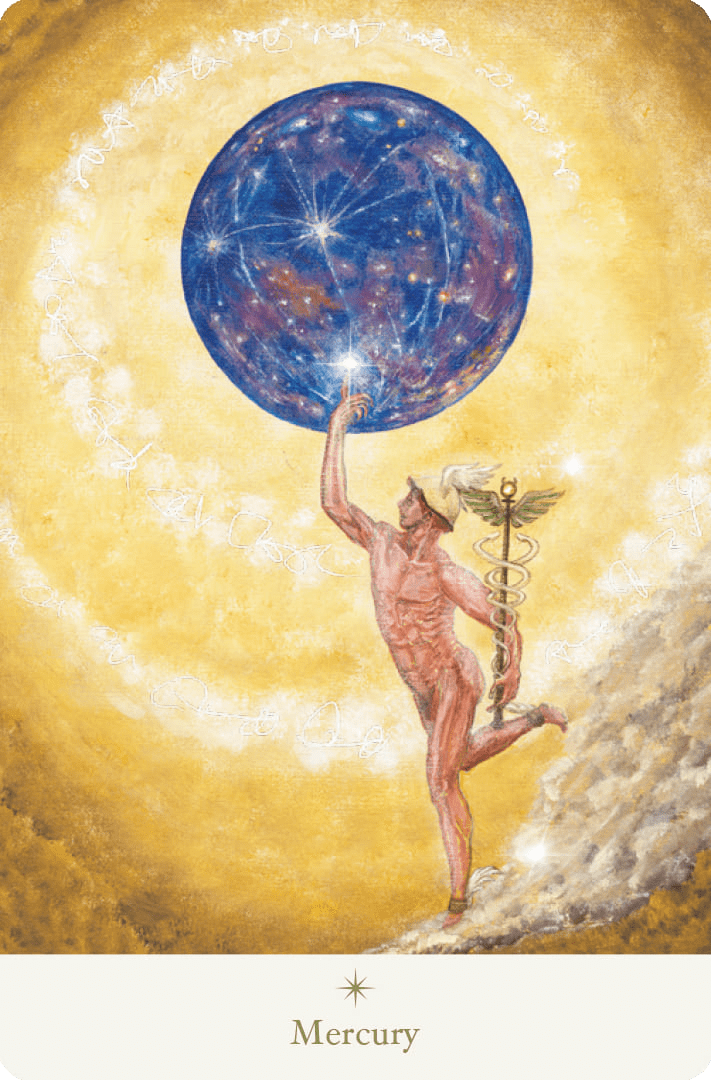 Mercury is a symbol of information, communication, and the power of the mind. It represents the speed and spark of spinning, the verbalization ability, imagination and curiosity, and power of invention. Look at your talents and language skills. This is your chance to try something you want to do now, something you’ve always wanted to do. The more you learn, the more you will develop your thinking skills, and the more you will unleash your unexpected talents. You can concentrate on one thing and learn it deeply, or you can go broad and shallow and gain miscellaneous knowledge. Be active in your community and absorb knowledge and information from the people you meet. Hermes is pictured on this card. He is the messenger of the heavens. He is a mischievous and beloved character, but he can also be very eloquent and cunning at times. Use his brightness and cheerfulness to attract wealth and good fortune.